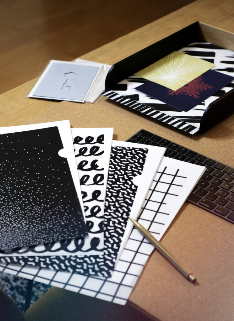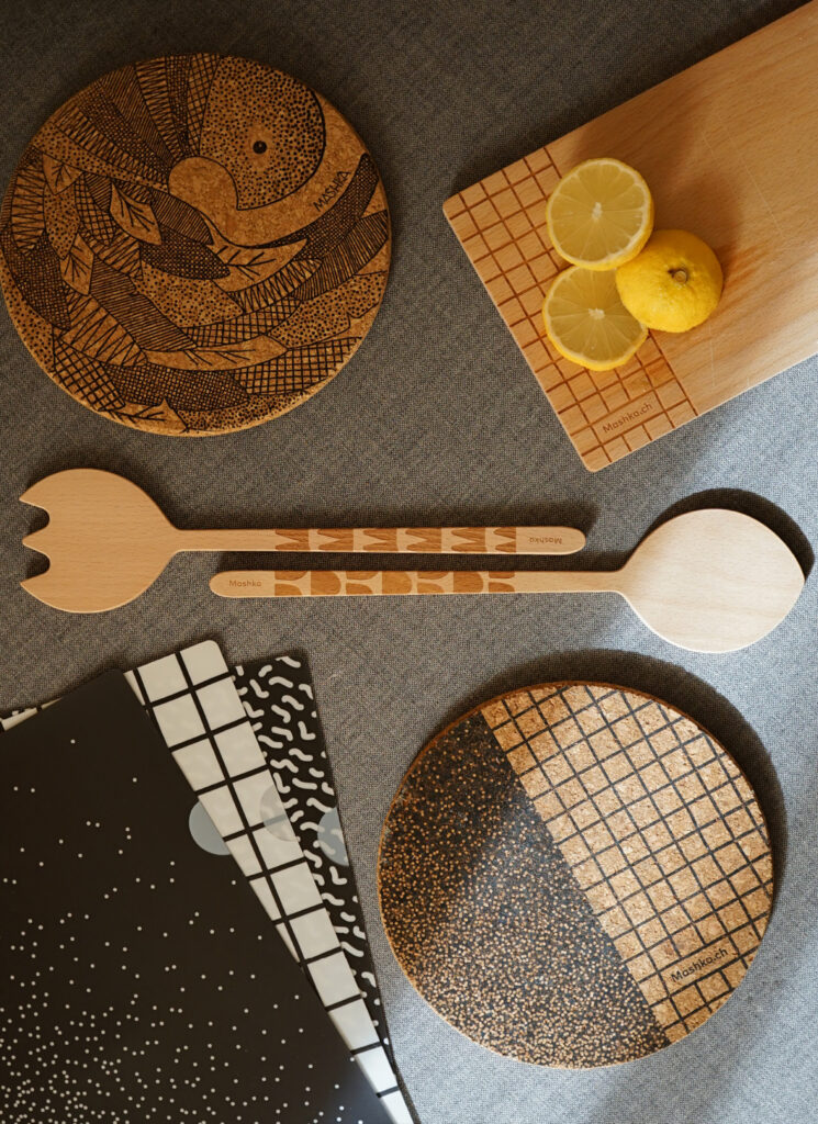 Accessoires de cuisine, décorations festives ou fournitures de bureau, chaque objet est soigneusement orné de motifs graphiques puis façonné dans la mesure du possible en collaboration avec des artisans locaux et dans des matériaux durables. »