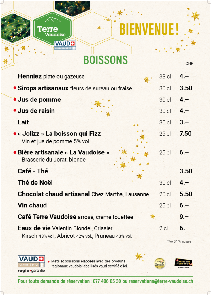 Réservation par mail à reservations@terre-vaudoise.ch ou par téléphone au 077 406 05 30