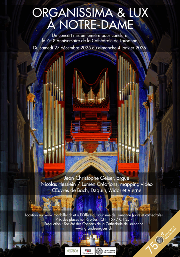 Le plus grand instrument de musique de Suisse, les grandes orgues superlatives de la Cathédrale de Lausanne, sous les doigts de leur titulaire, Jean-Christophe Geiser, concluront l’année du 750ᵉ de la Cathédrale en 2025. Symboliquement, ces concerts, donnés tous les soirs depuis le 17 décembre, ne s’arrêteront pas fin 2025, mais se poursuivront jusqu’au 4 janvier 2026, marquant ainsi la marche du temps pour un édifice qui continuera à défier les siècles.